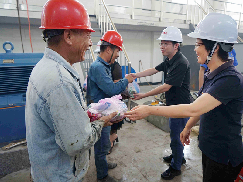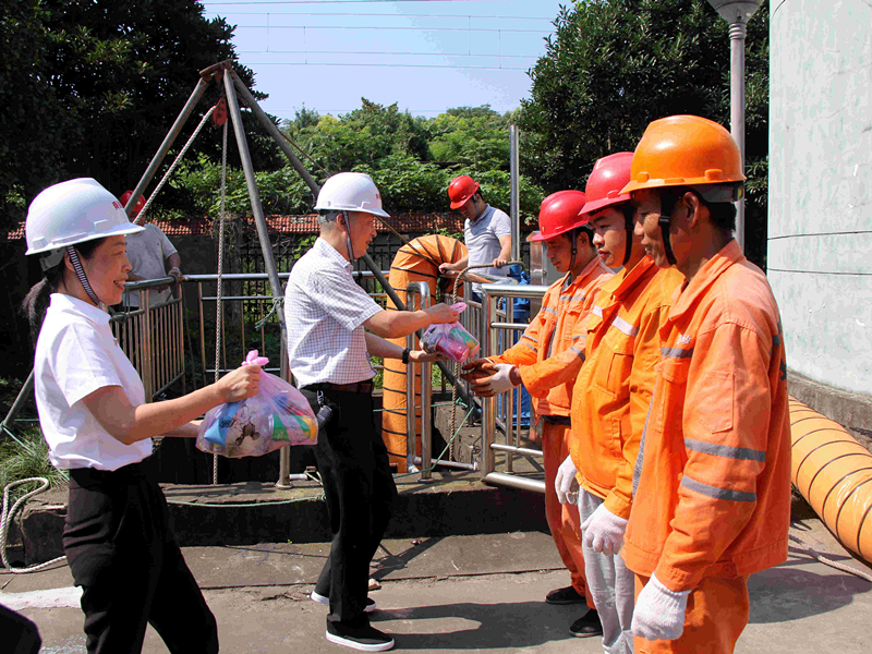 7月22日正值大暑節(jié)氣,集團(tuán)公司黨委班子成員兵分三路,赴集團(tuán)所屬城投公司、自來(lái)水公司、第二自來(lái)水公司、姚東公司、排水公司、天然氣公司、景邑停車(chē)產(chǎn)業(yè)公司、首創(chuàng)水務(wù)公司和首創(chuàng)污水公司,以及悅觀庭供水管道安裝工程、新悅府一期施工工地、馬渚大橋橋管改造工程、馬渚水廠水泵安裝工程、丈亭漁溪村一戶一表改造工程、候青門(mén)立交泵站清淤作業(yè)和陽(yáng)明街道北郊村農(nóng)污管道沖洗等7處施工作業(yè)現(xiàn)場(chǎng)開(kāi)展高溫慰問(wèn),給夏日高溫下堅(jiān)守崗位的一線職工送去絲絲清涼。